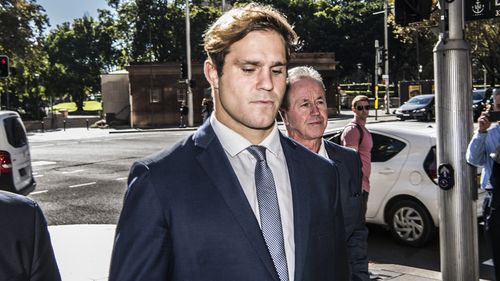 Jack de belin arrives at wollongong courthouse with his manager steve gillis (right) as jury deliberations commence.